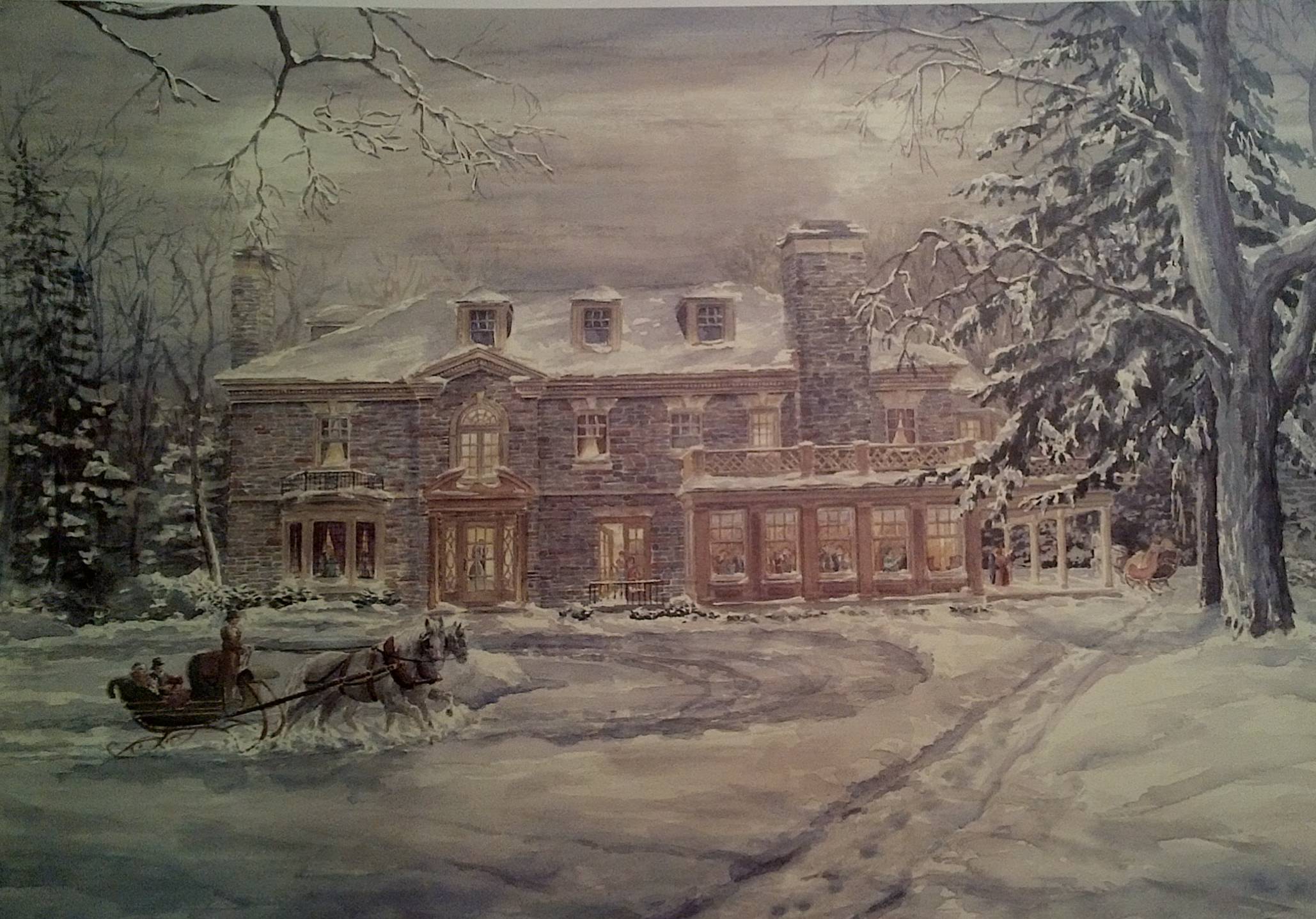 This picturesque mansion sits on the parcel of land in Burlington that was originally deeded to Laura Secord by King Edward VII. It is now open to the public. The scene captures the romance of an evening sleigh ride